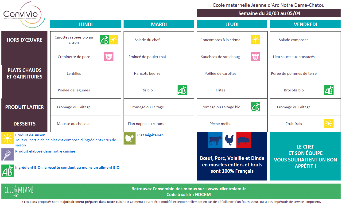 La restauration scolaire est assurée par notre prestataire Convivio, qui élabore des menus équilibrés à base de produits frais, de saison et bio, et parfois cuisinés sur place. Les repas privilégient la diversité des saveurs, la découverte de nouveaux aliments et le respect des besoins nutritionnels de chaque enfant.
