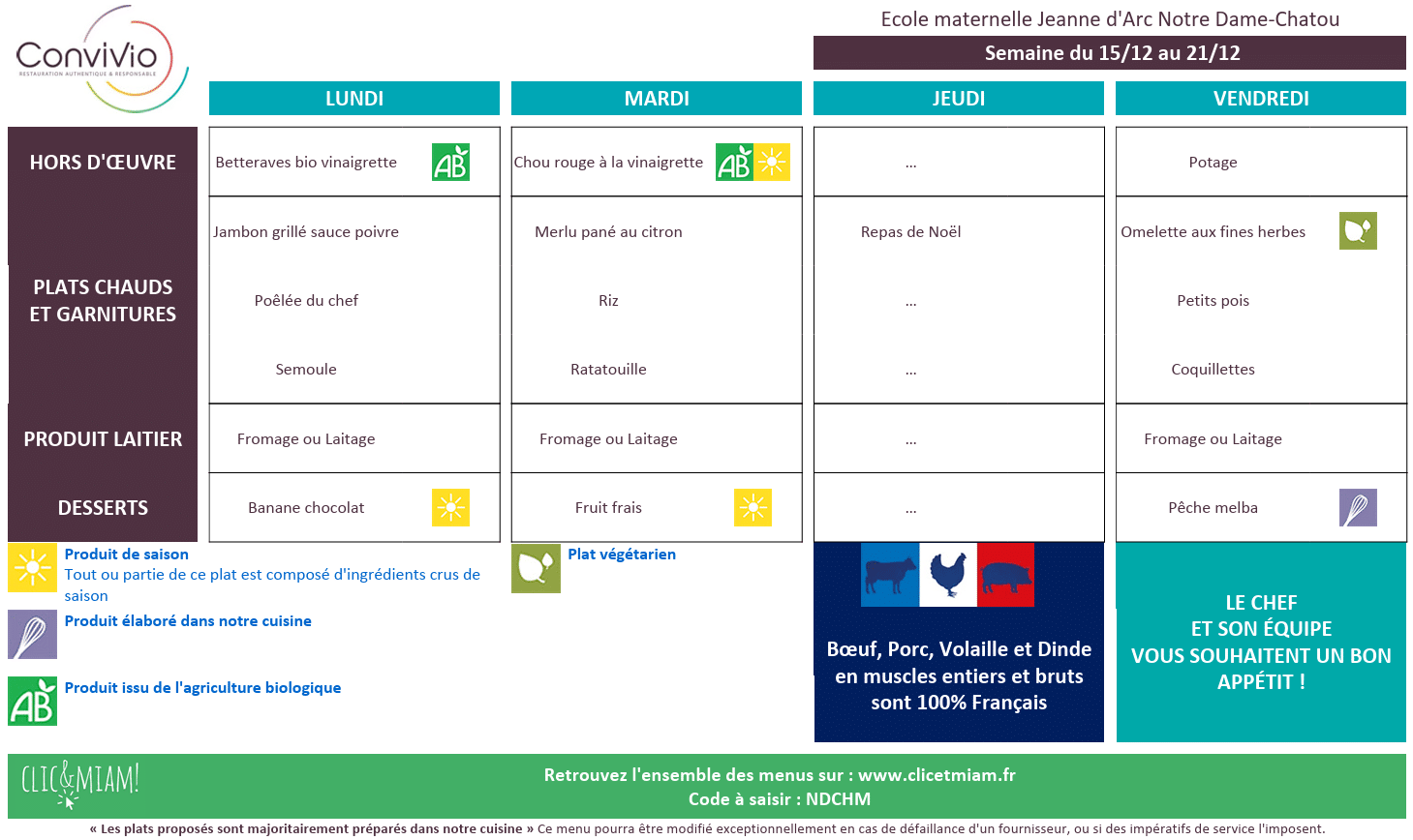 La restauration scolaire est assurée par notre prestataire Convivio, qui élabore des menus équilibrés à base de produits frais, de saison et bio, et parfois cuisinés sur place. Les repas privilégient la diversité des saveurs, la découverte de nouveaux aliments et le respect des besoins nutritionnels de chaque enfant.
